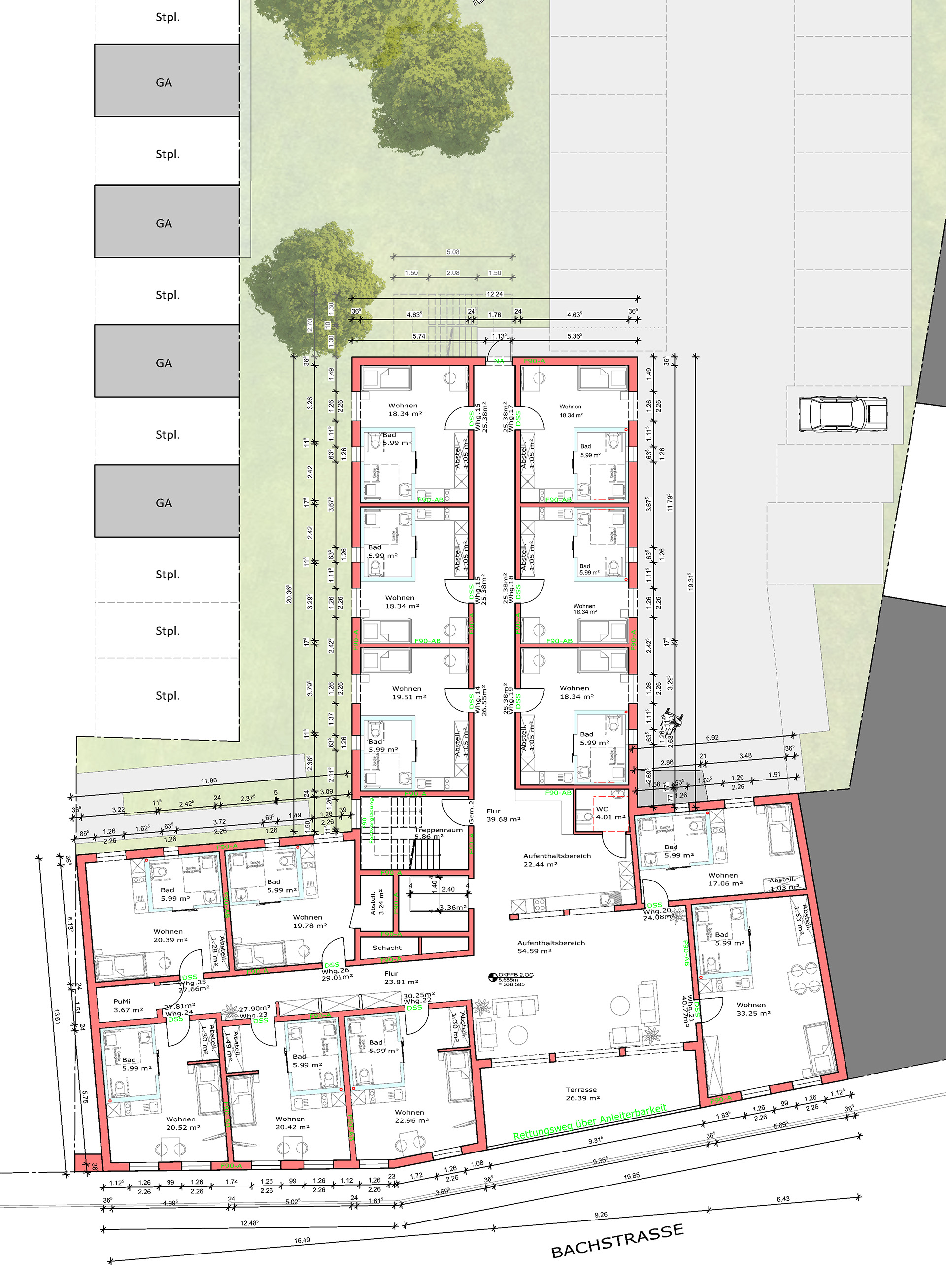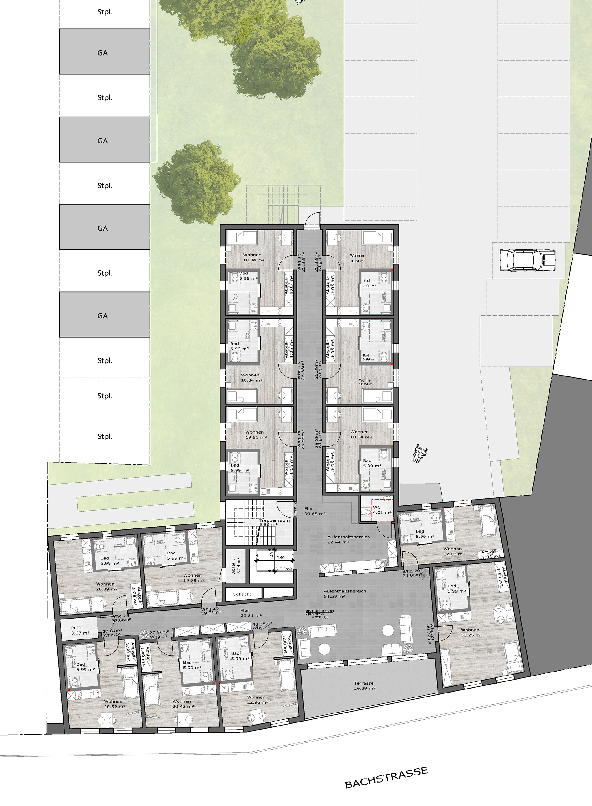 Das Architektenbüro Michael Mies GmbH übernimmt sowohl die vollständige Bauplanung als auch die Bauleitung. Das barrierefrei konzipierte Gebäude zeichnet sich durch eine hochenergieeffiziente Bauweise aus und verfügt über zahlreiche Stellplätze sowie Garagen.